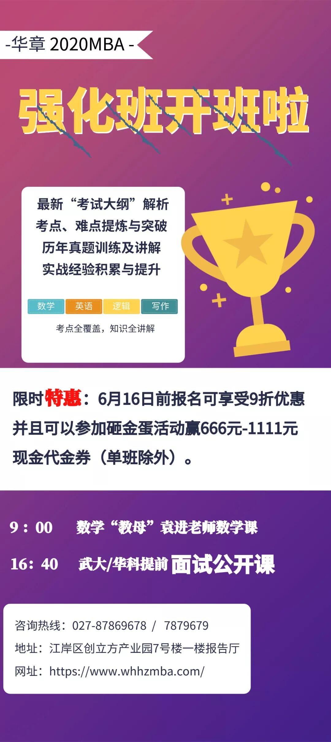 武汉华章2020MBA 强化班将在本周星期天(6月16日)在武汉江岸区创立方产业园7号楼一楼报告厅盛大开课。
