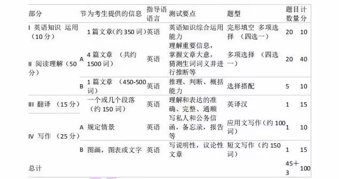 试题分四部分,共48题,包括英语知识运用、阅读理解、英译汉和写作。